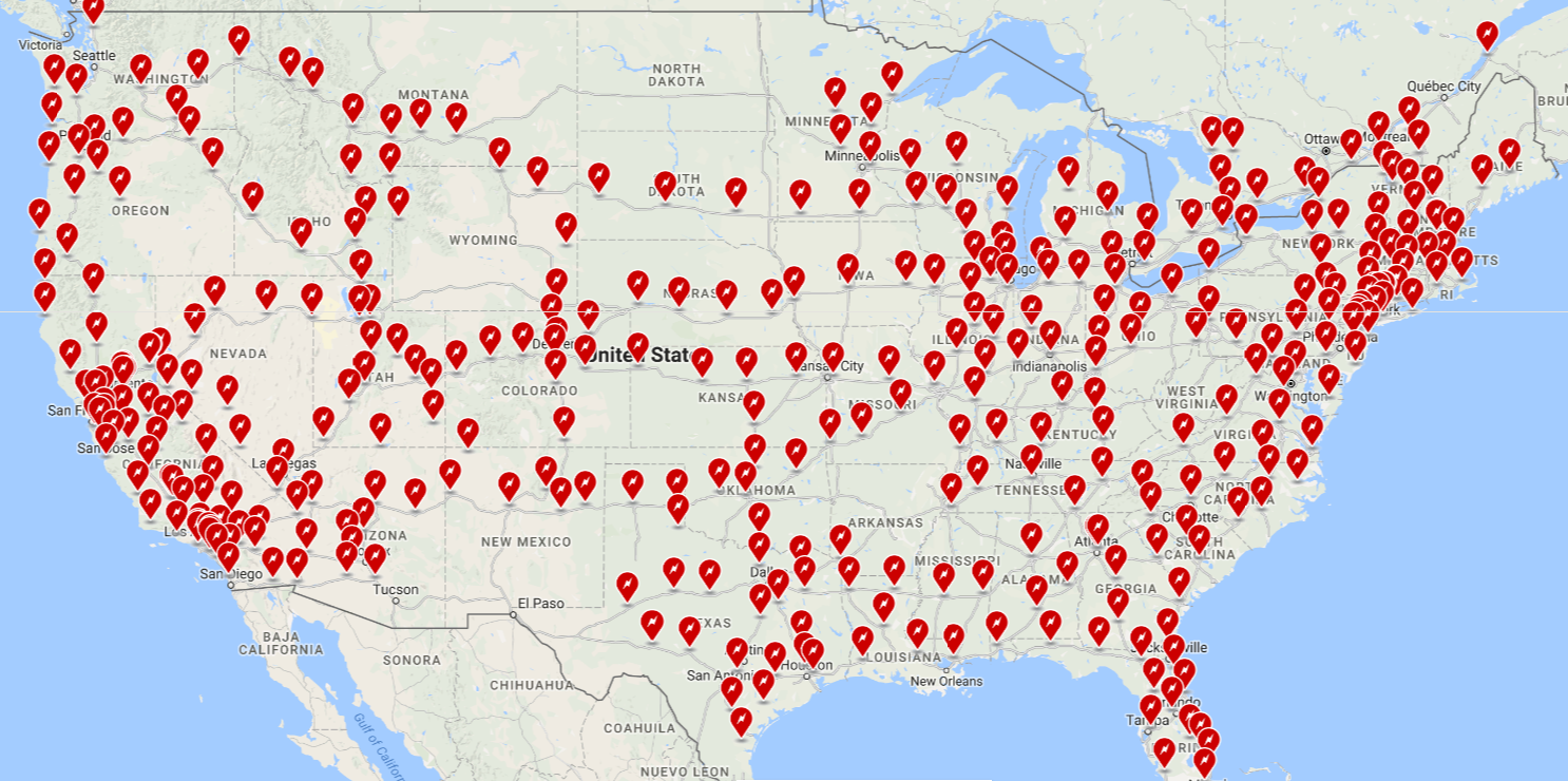 “But what if I want to go on a road trip?” Great question! If you are a Tesla owner, the Supercharger map above shows their Supercharger network (more info here). It is a high powered network that will add 180 miles of range to your car in 30 minutes. Leaving your home with a full charge of 220 miles means you can drive up to 400 miles – stopping only once for 30 minutes to charge. This is usually free for Tesla drivers.
